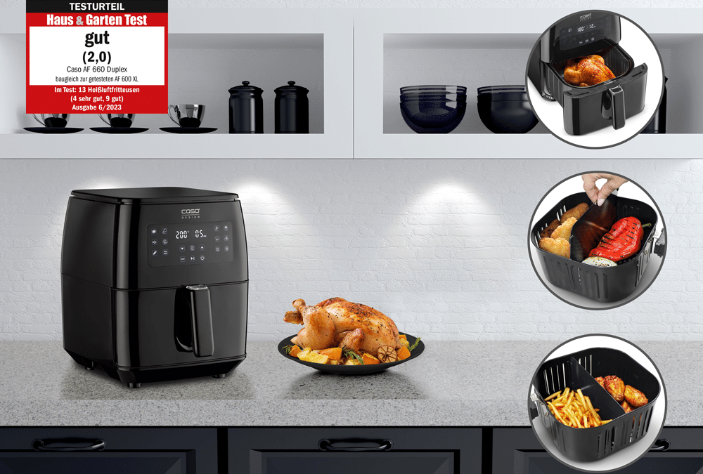 Mit der neuen XL-Heißluftfritteuse AF 660 Duplex von CASO Design lassen sich Pommes, Fisch, Gemüse, Gebäck und vieles mehr auch ohne Fett perfekt zubereiten. Die AF 660 Duplex kann aber noch mehr: Mit der herausnehmbaren Trennwand können verschiedene Lebensmittel gleichzeitig gegart werden. Mit nur 43 Dezibel ist die Heißluftfritteuse dabei auch noch flüsterleise.